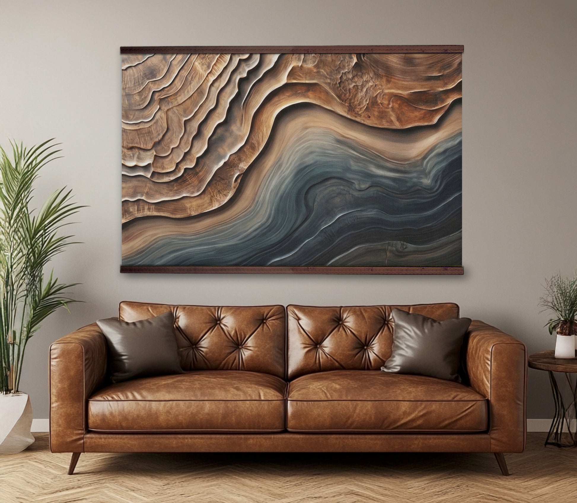 The contrast between warm natural browns and cool blue-green hues gives this piece a refined, contemporary edge while remaining grounded in organic design. Its panoramic format makes it an ideal statement piece for large walls in living rooms, offices, bedrooms, or modern rustic interiors.