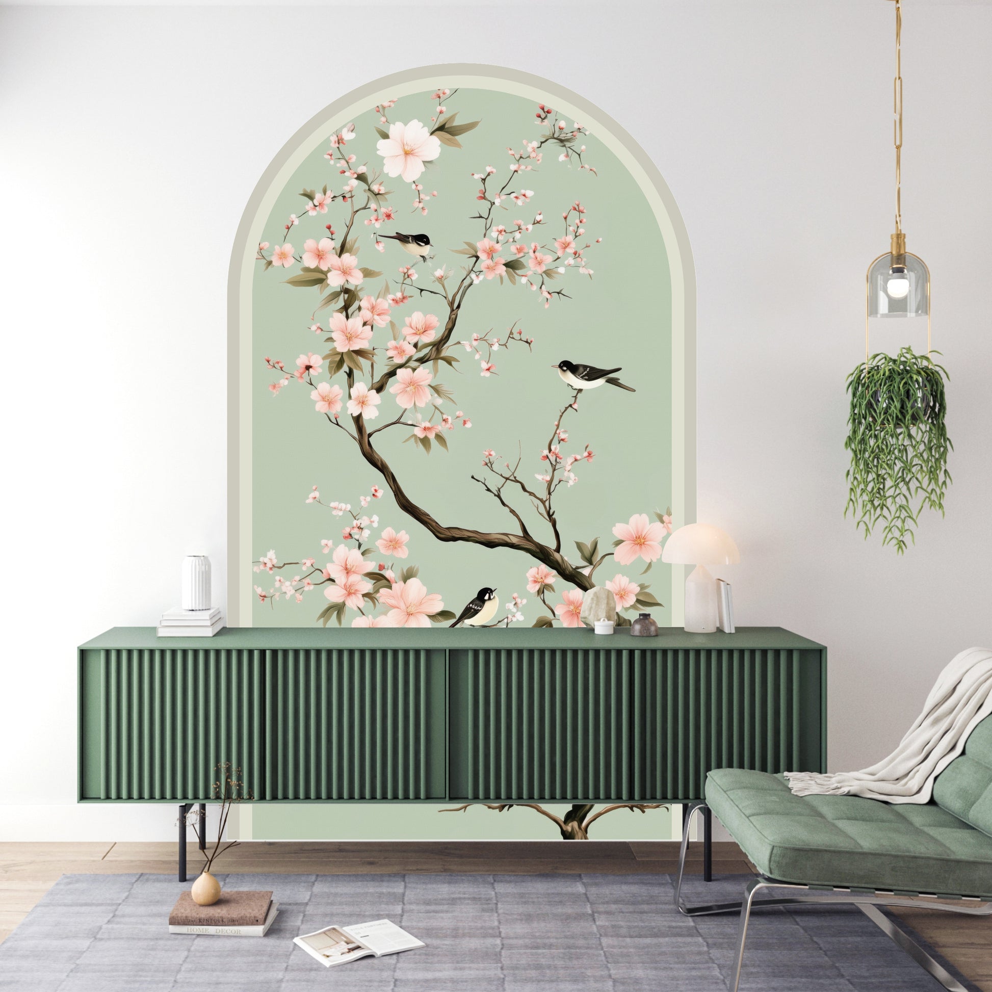 Bring softness and timeless elegance to your space with this chinoiserie cherry blossom peel & stick arch wall mural. Featuring delicate pink blossoms, graceful branches, and small birds set against a fresh mint green background, this design is inspired by classic chinoiserie art and refined botanical illustrations.