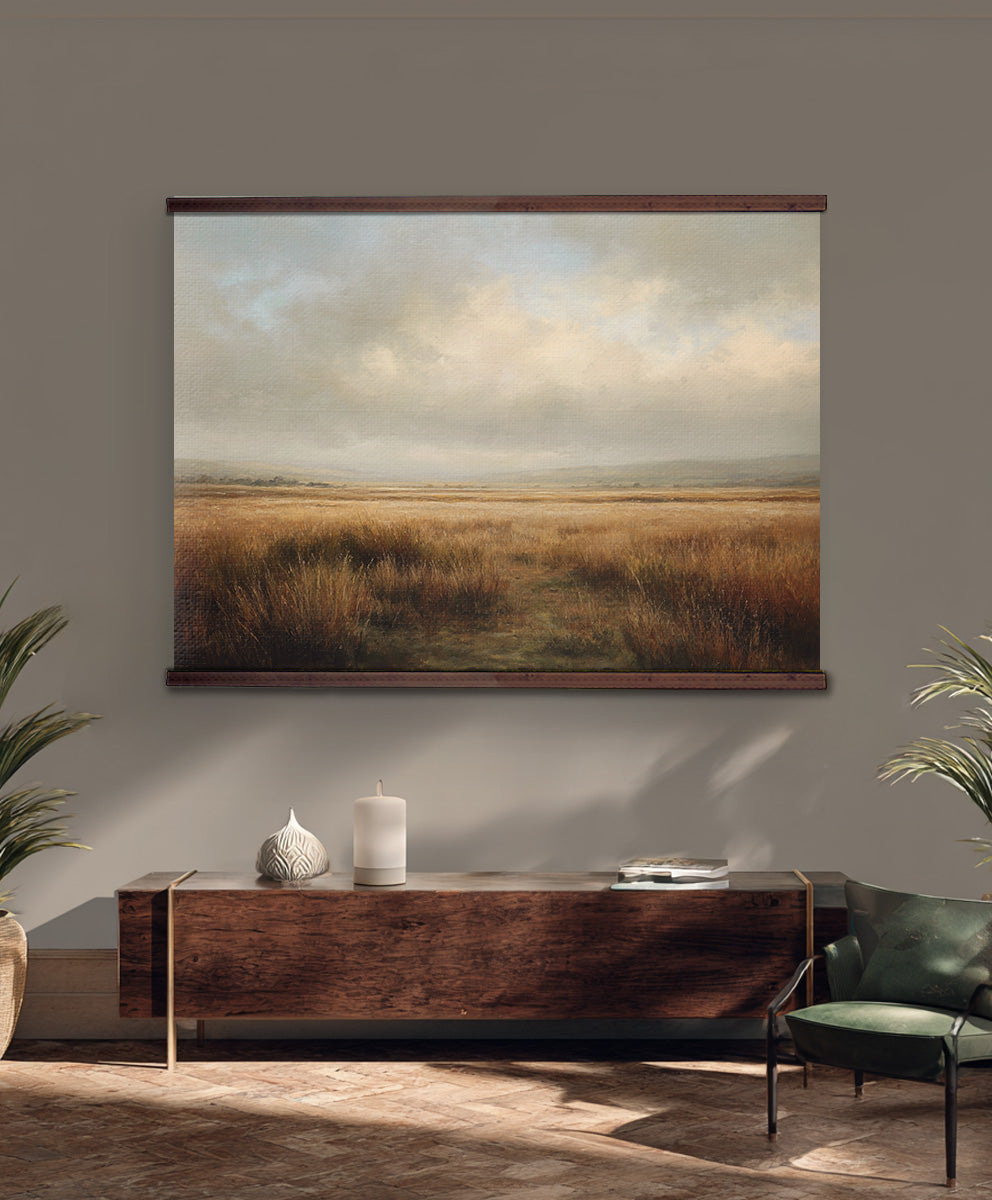 Golden Meadow Tapestry – Warm Landscape Wall Art, Rustic Field Wall Hanging, Neutral Nature Decor, Extra Large Art