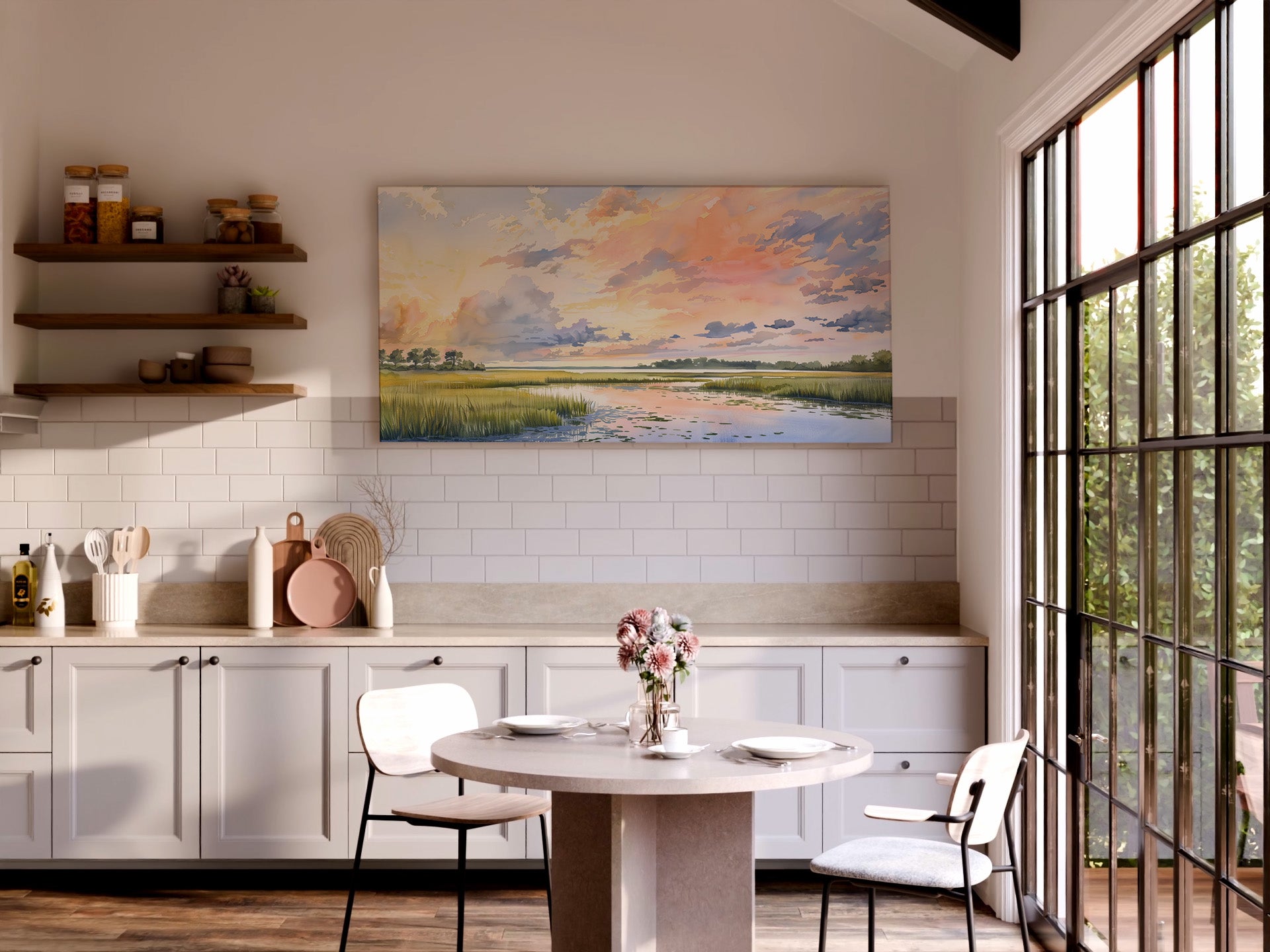 Bring the peaceful beauty of a coastal marsh sunset into your home with this soft, dreamy landscape artwork. Gentle pastel skies, warm golden light, and calm reflective water create a soothing, elegant piece that brightens any room. It’s the perfect blend of nature, color, and tranquility.