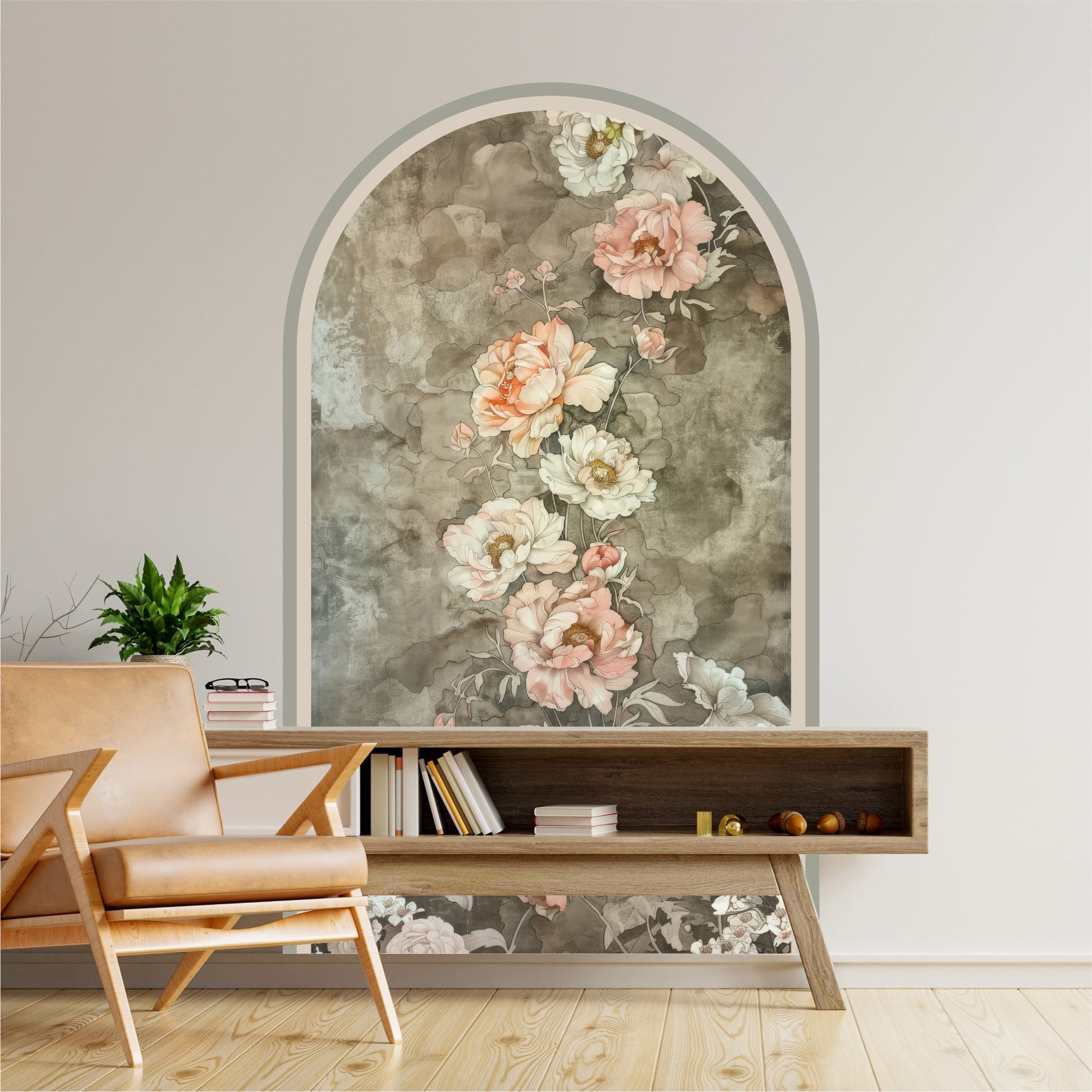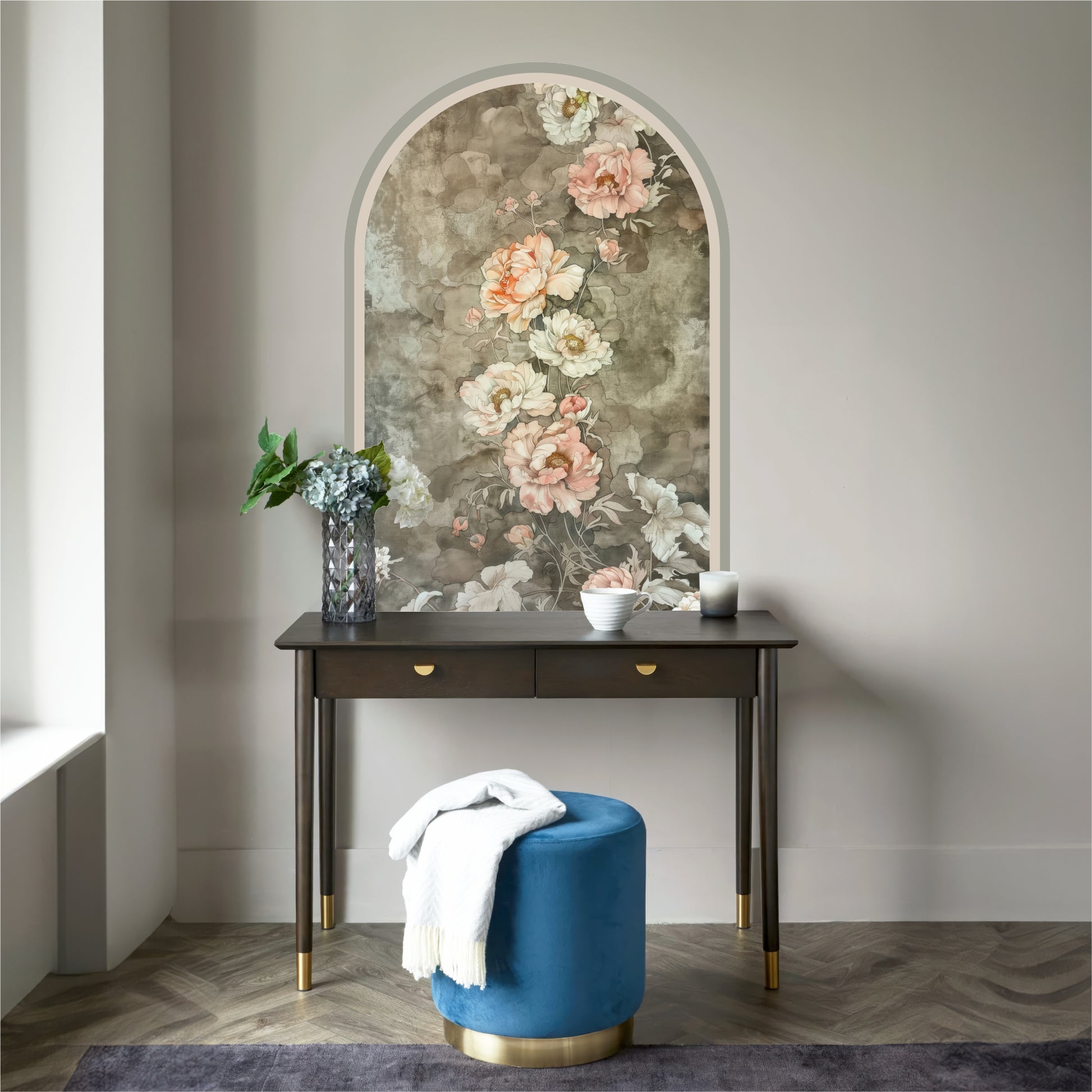 Create a refined, artful atmosphere with this vintage botanical peel & stick arch wall mural. Featuring delicate florals in warm blush and ivory tones layered over a softly aged, fresco-style background, this design brings depth, texture, and timeless elegance to any interior.