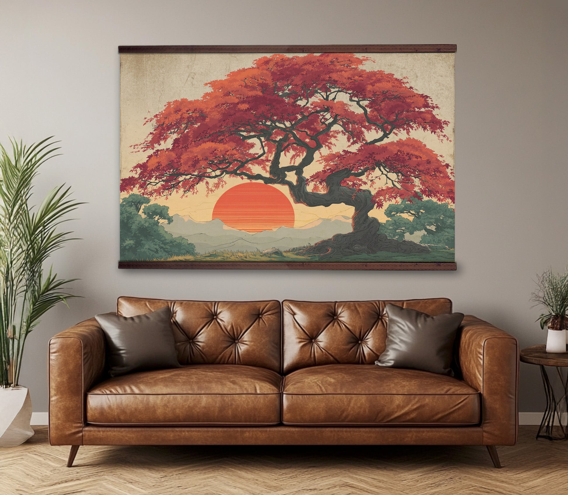 Bring dramatic color and peaceful energy into your home with this stunning Japanese-inspired wall hanging. A fiery red maple tree spreads across a glowing sunset sky, with distant mountains adding depth and serenity. The rich tones and bold silhouette create a striking focal point that transforms any room.