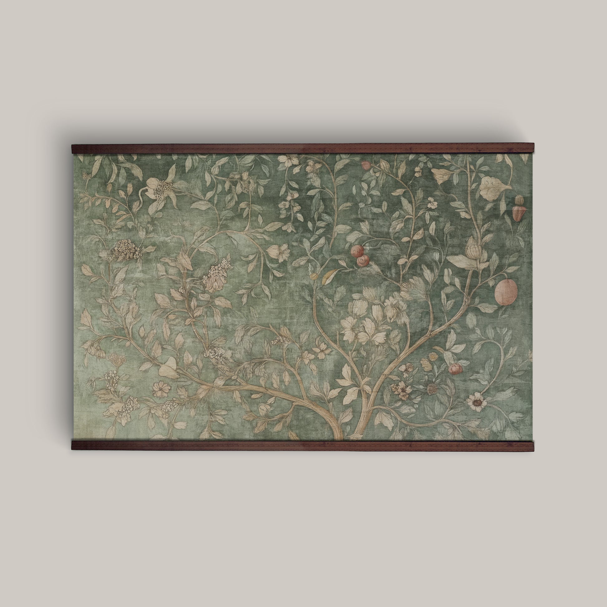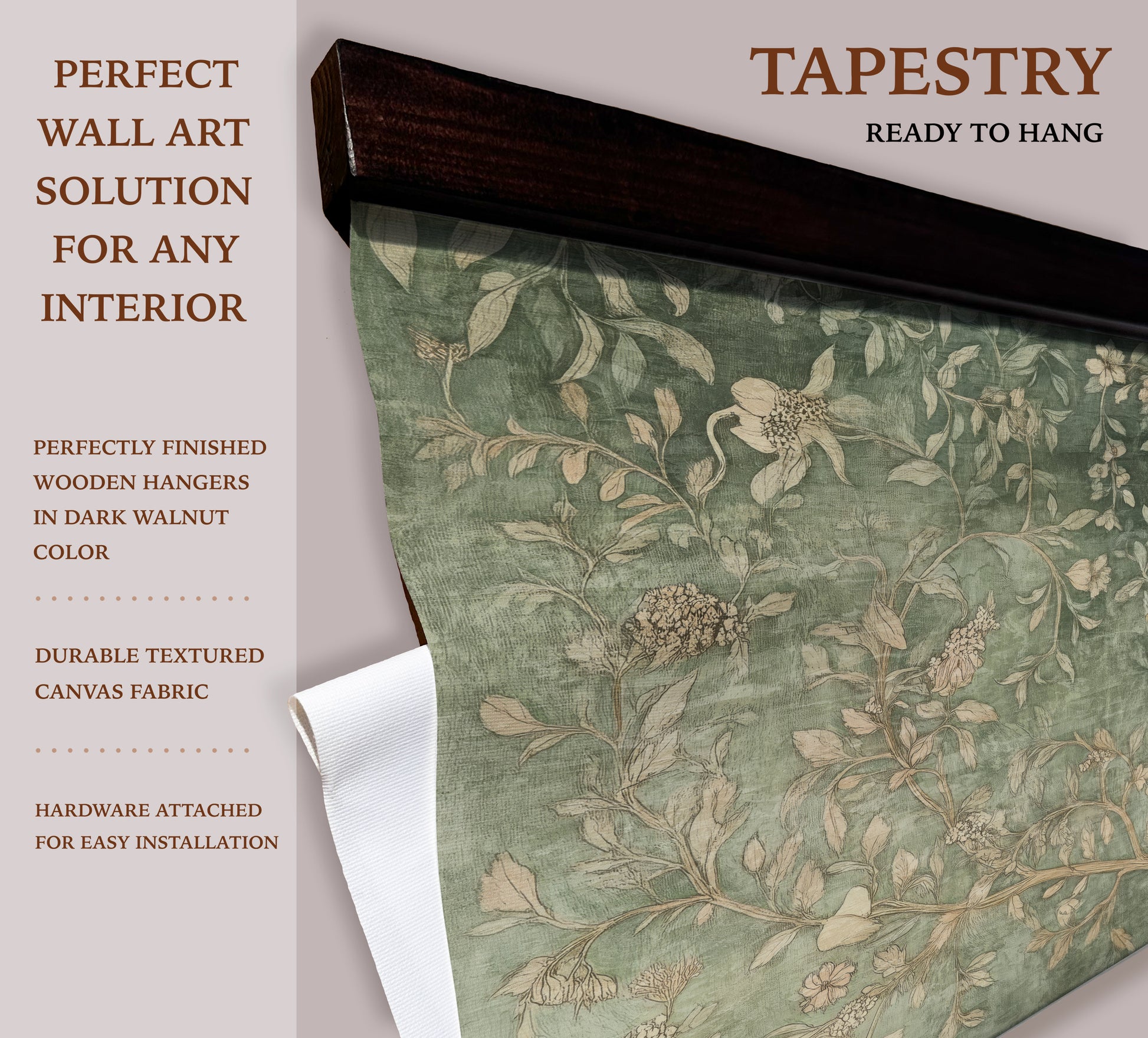 Sage Green Botanical Tapestry Wall Art – Vintage Floral Tree Design with Wooden Hangers | Art Muse