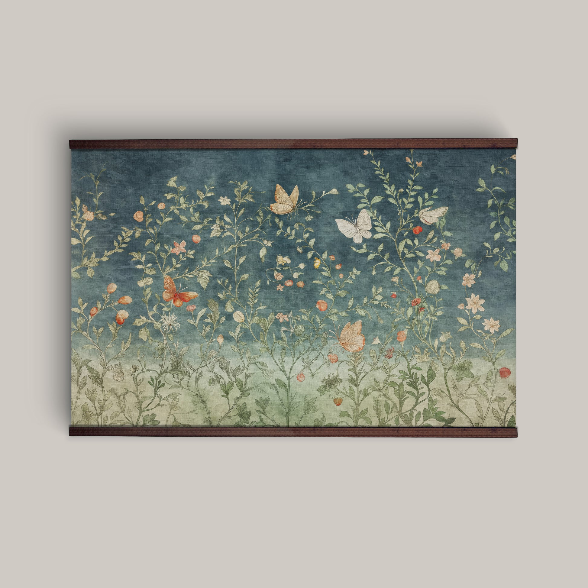 Butterfly Meadow Tapestry Wall Art – Blue & Sage Botanical Design with Wooden Hangers | Art Muse