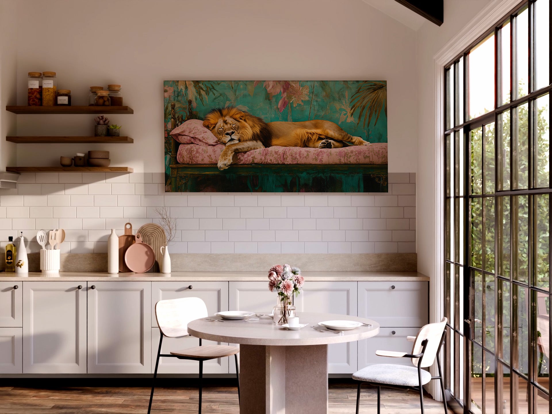 Add bold personality and luxurious charm to your home with this striking wrapped canvas featuring a majestic lion resting on an ornate vintage chaise. Rich teal tones, floral patterns, and golden details create a lush, maximalist atmosphere — while the peaceful, sleepy lion adds warmth and character.