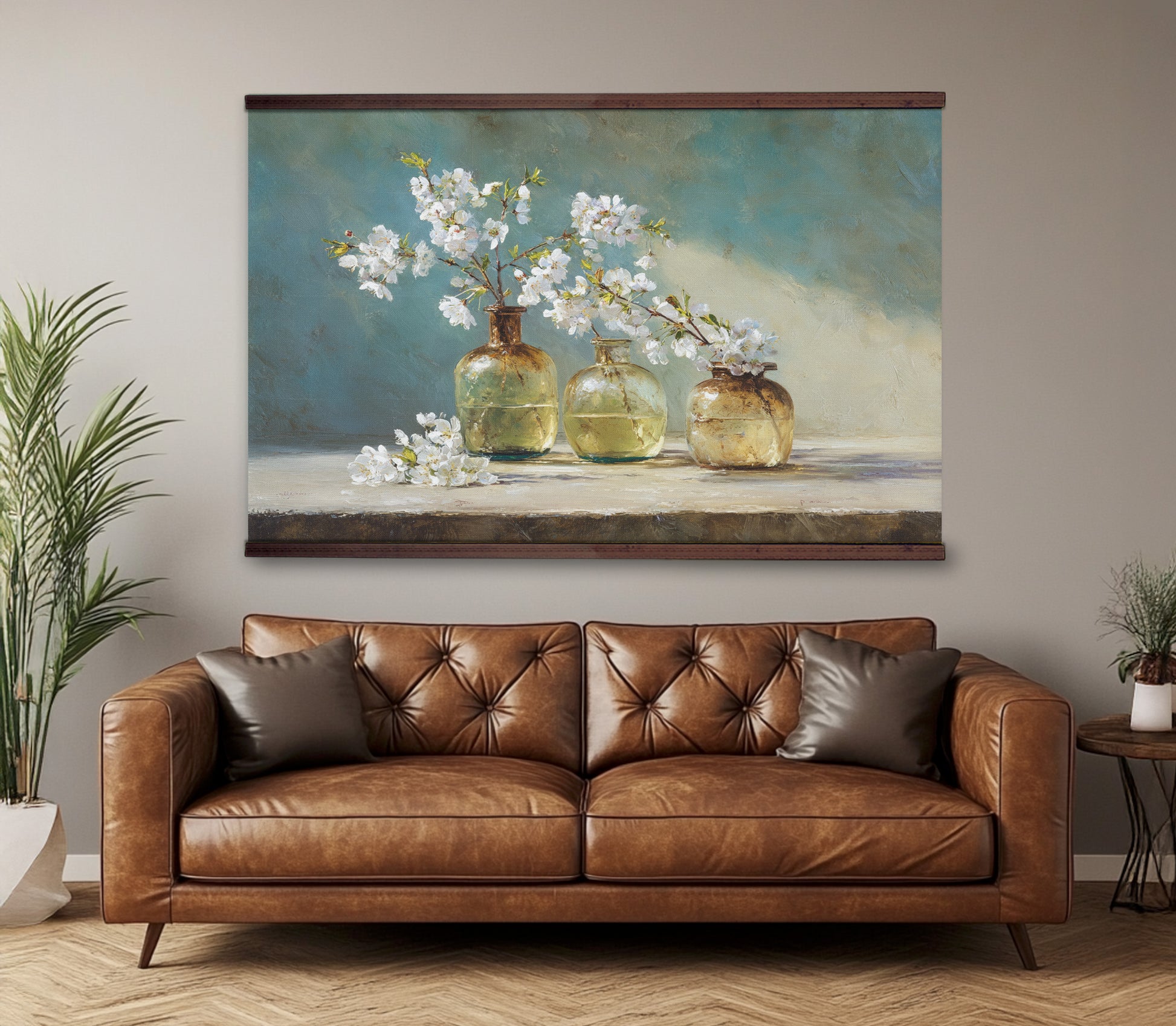 Add a touch of quiet elegance to your home with this Cherry Blossom Still Life tapestry, featuring delicate white blossoms arranged in three vintage glass vases. Soft spring light, painterly texture, and gentle pastel tones create a serene, uplifting mood that complements both modern and classic interiors.