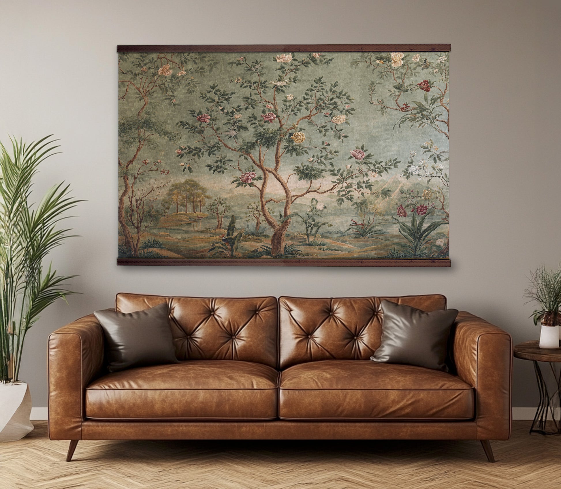 Bring timeless elegance to your home with the Art Muse Vintage Botanical Garden Tapestry — a stunning chinoiserie-inspired landscape featuring blooming florals and lush greenery in soft sage tones. The painterly detail and classic palette make this piece a perfect focal point for both modern and traditional interiors.