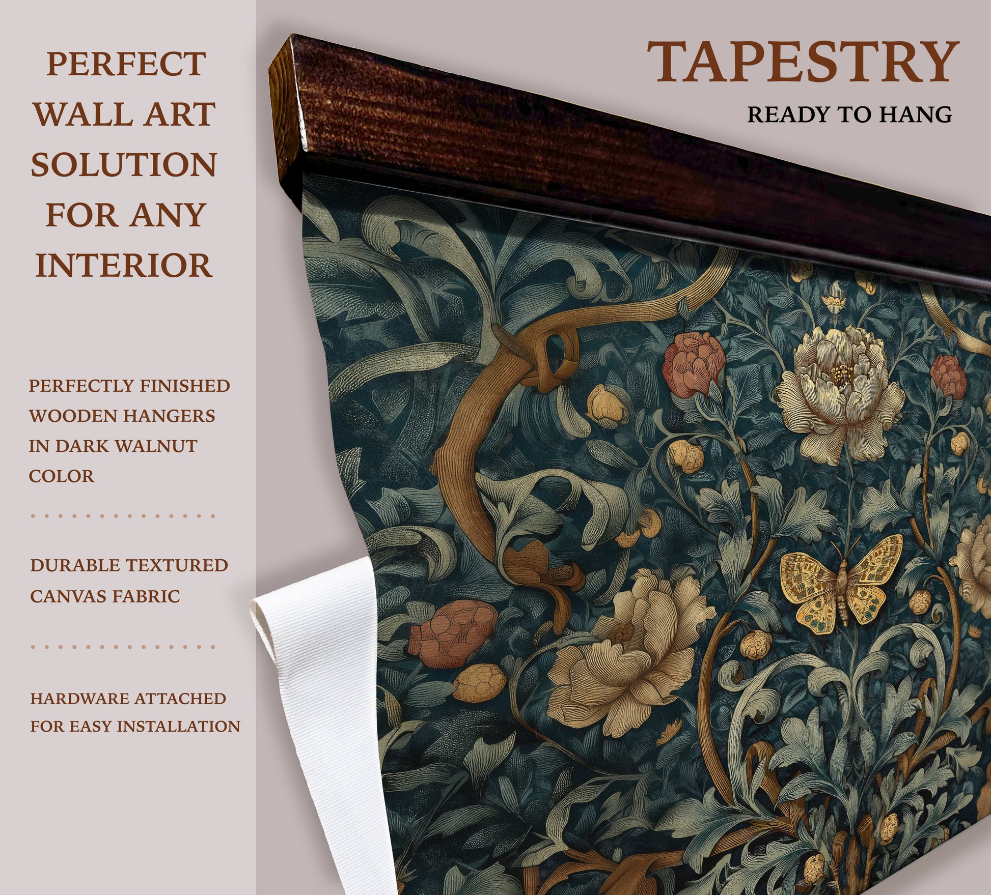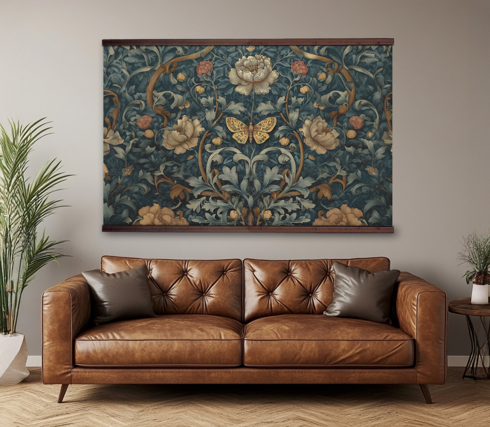 Embrace timeless artistry with this Vintage Botanical Tapestry, inspired by the iconic patterns of William Morris. Set against a rich midnight-blue background, golden florals intertwine with soft foliage, framing a delicate butterfly at the center — a symbol of harmony and transformation.