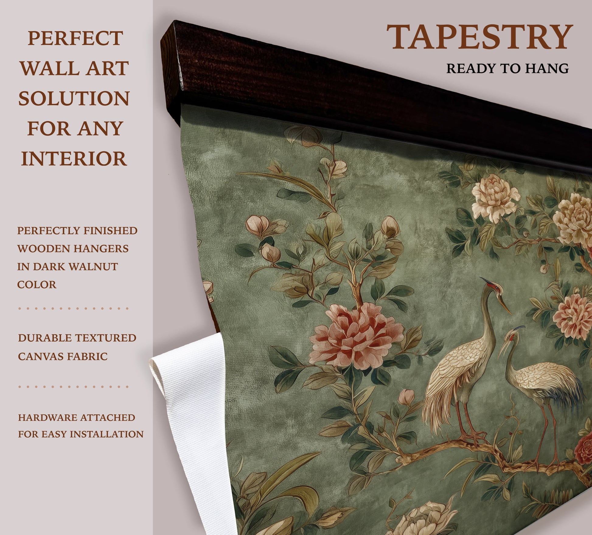Vintage Crane & Peony Tapestry Wall Art – Sage Green Botanical Design with Wooden Hangers | Art Muse