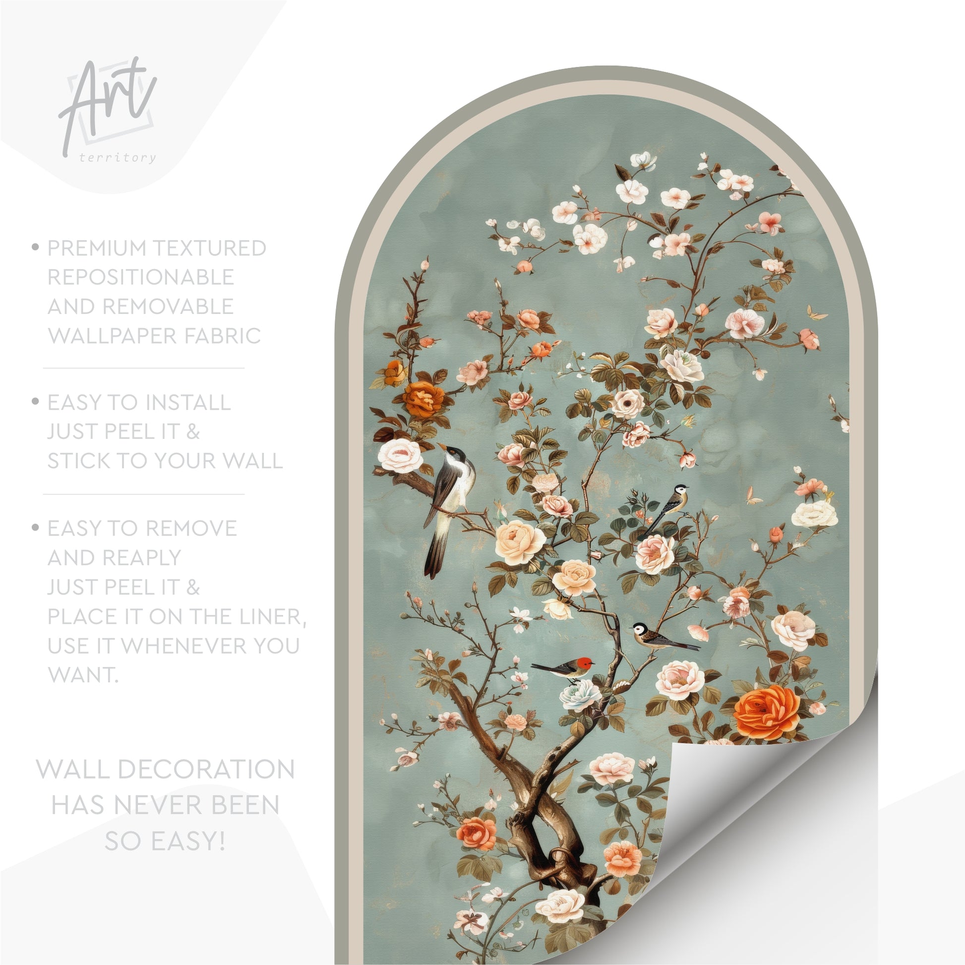 Vintage Floral Bird Peel and Stick Wall Mural – Removable Botanical Wallpaper Arch
