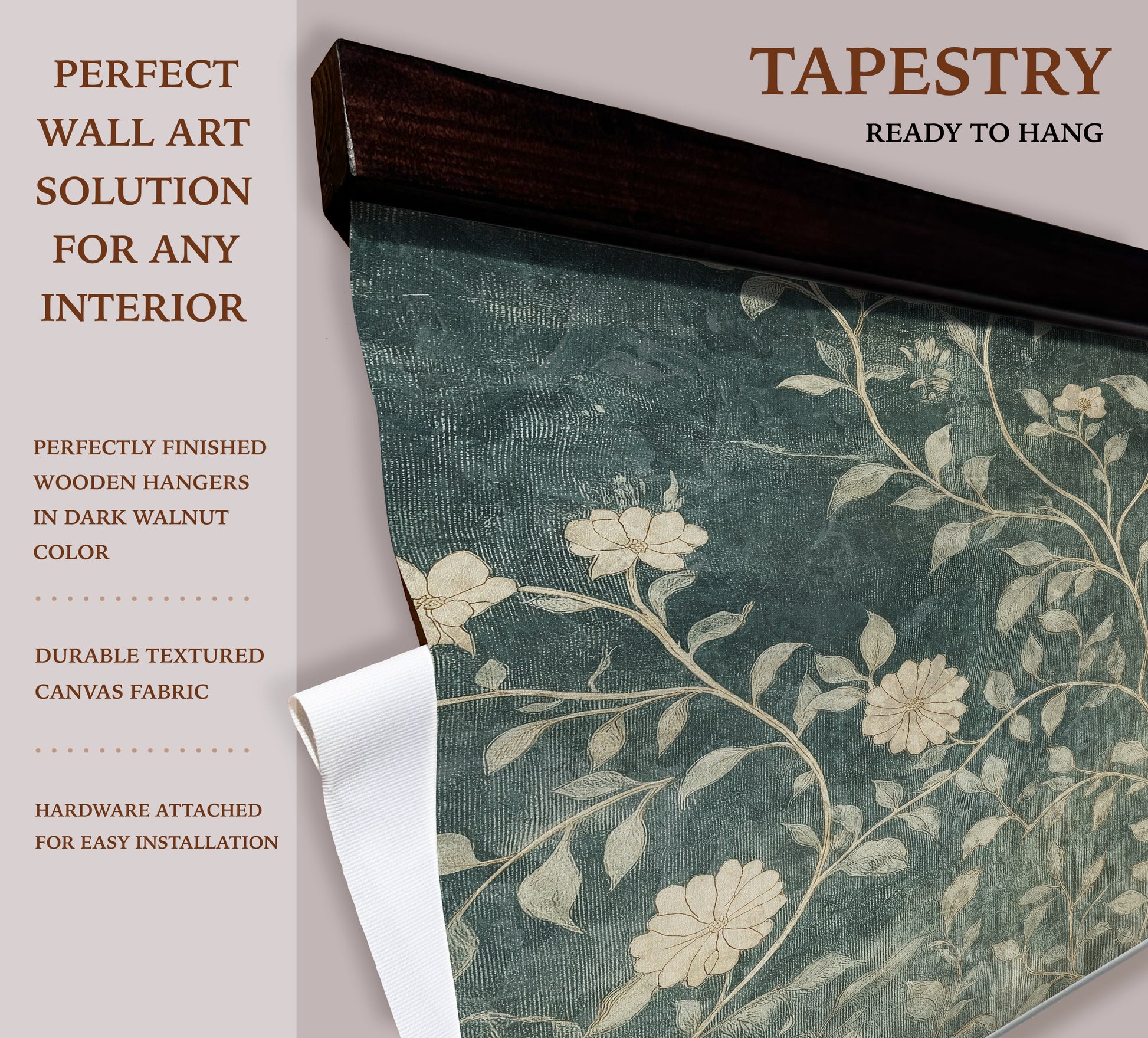 Add subtle sophistication to your interior with the Vintage Teal Floral Tapestry, featuring delicate ivory blooms and soft botanical vines over a deep teal backdrop. Its aged, painterly texture evokes a timeless charm that blends effortlessly with modern or classic décor.