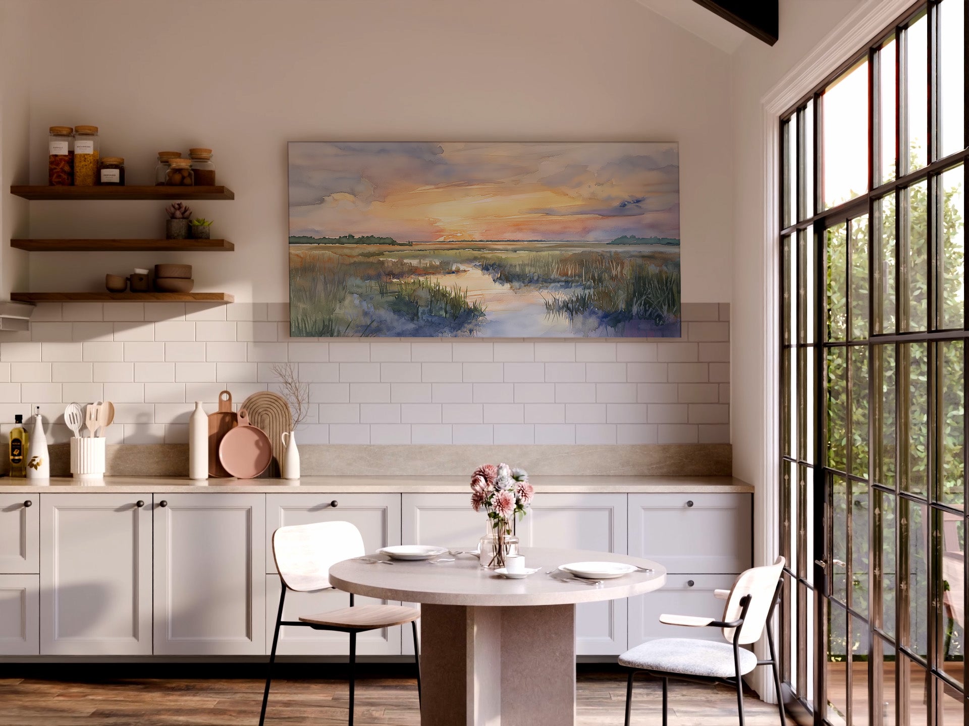 Bring gentle color and coastal calm into your home with this beautiful watercolor-style marsh sunset wrapped canvas. Soft pastels, golden light, and delicate brush textures create a peaceful landscape that feels airy, uplifting, and timeless.